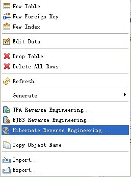 2.选择要生成的table,在table上点击右键,选择hibernate反向工程