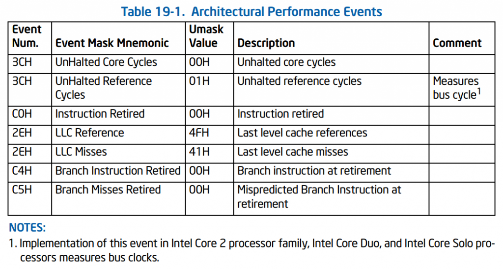 通常一般处理会有6-8组PMC寄存器,可以同时记录多个可检测事件,检测之前需要在阈值对应控制寄存器(IA32_PERFEVTSELx MSRs)中的掩码字节{Unit mask (UMASK) field} 中指定记录的事件,事件举例如下表: