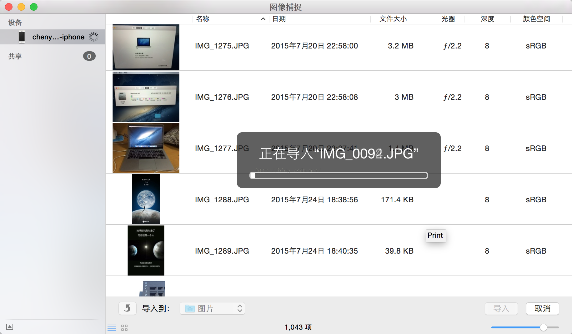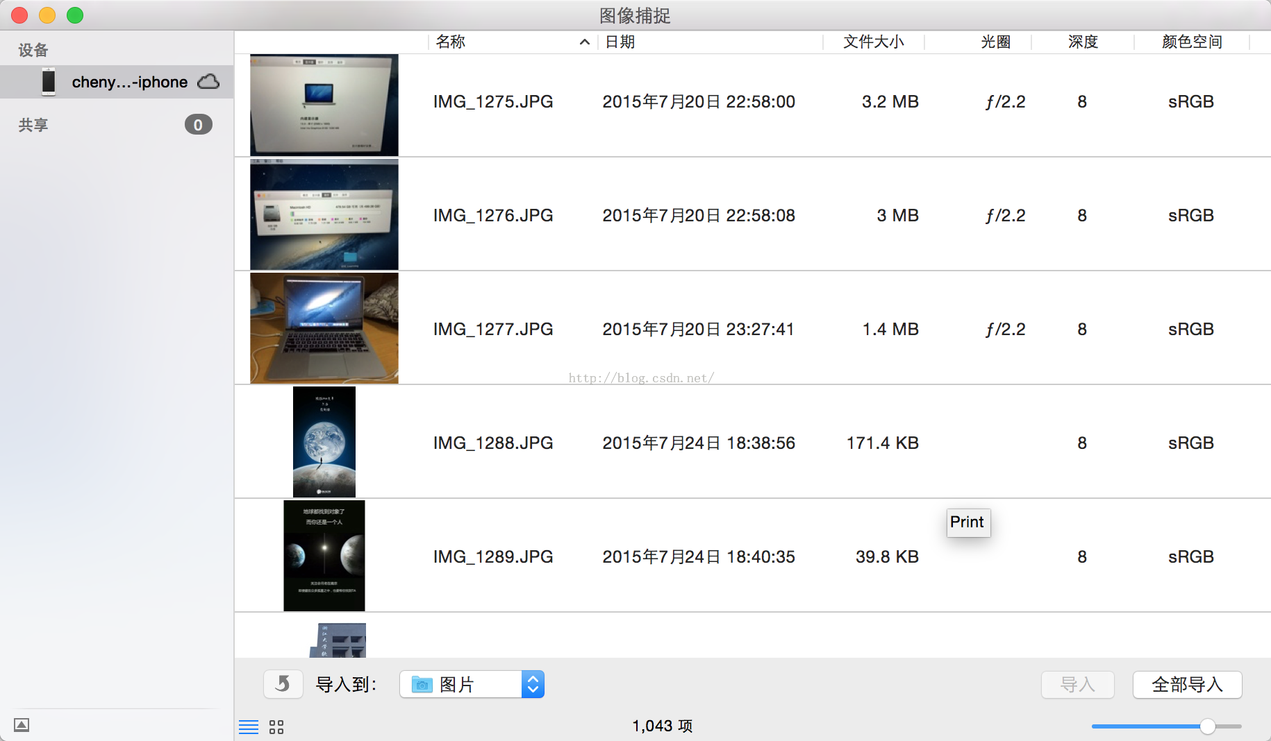 (2)自己建一个文件夹,用于存放等下从手机导出的照片。打开“图像捕捉“程序,此时就能自动读取手机中的照片啦。如图: