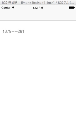 - (void)viewDidLoad{ [super viewDidLoad]; // Do any additional setup after loading the view. //电话号码 UILabel *telLabel = [[UILabel alloc] initWithFrame:CGRectMake(10, 100, 200, 20)]; telLabel.textColor = [UIColor grayColor]; telLabel.text = @"13793333281"; //字符串的截取 NSString *string = [telLabel.text substringWithRange:NSMakeRange(4,4)]; //字符串的替换 telLabel.text = [telLabel.text stringByReplacingOccurrencesOfString:string withString:@"----"]; [self.view addSubview:telLabel];}
