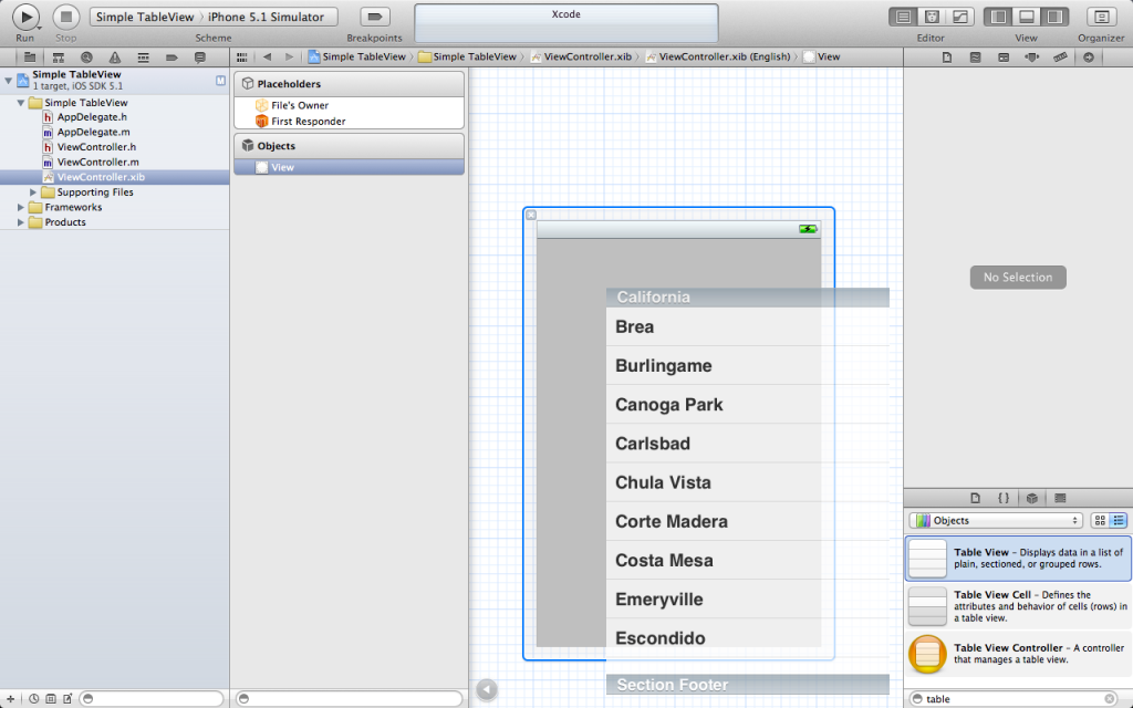 ???4.单击ViewController.xib文件,在View视图上添加控件Table View: