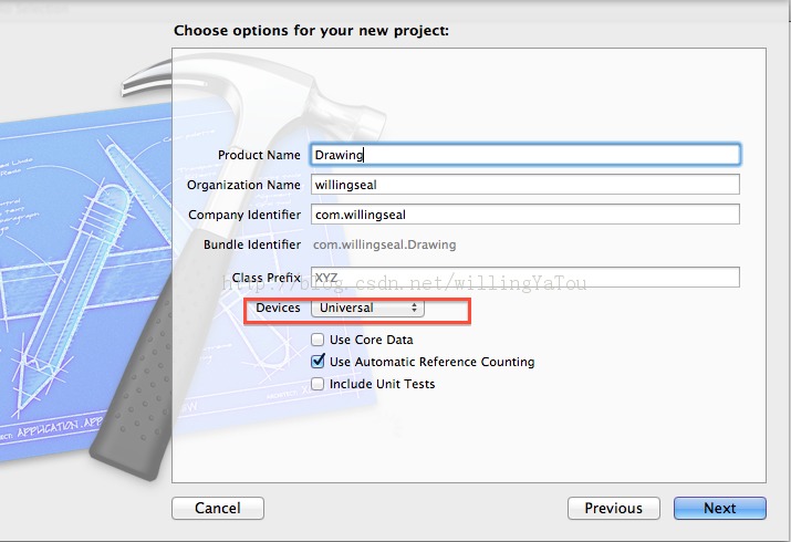 (一)先创建一个空的工程,这里特别注意Devices(设备)一栏要选择Universal (通用的),因为我们要用到iphone和ipad两种设备。