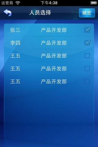 #import "MultiChoceViewController.h"#import "MultiChoceCell.h"@interface MultiChoceViewController ()@end@implementation MultiChoceViewController- (void)viewDidLoad{ [super viewDidLoad]; [_mTableView setBackgroundColor:[UIColor clearColor]]; // Do any additional setup after loading the view from its nib.}- (void)didReceiveMemoryWarning{ [super didReceiveMemoryWarning]; // Dispose of any resources that can be recreated.}#pragma mark UITableViewDataSource- (NSInteger)tableView:(UITableView *)tableView numberOfRowsInSection:(NSInteger)section{ return [_itemArray count];}- (UITableViewCell *)tableView:(UITableView *)tableView cellForRowAtIndexPath:(NSIndexPath *)indexPath{ static NSString *identifier = @"itemCell"; MultiChoceCell *cell = [tableView dequeueReusableCellWithIdentifier:identifier]; if (cell == nil) { NSArray *array = [[NSBundle mainBundle] loadNibNamed:@"MultiChoceCell" owner:self options:nil]; cell = [array objectAtIndex:0]; } NSDictionary *dict = [_itemArray objectAtIndex:indexPath.row]; cell.nameLabel.text = [dict objectForKey:@"UserName"]; cell.departLable.text = [dict objectForKey:@"DepartMent"]; if ([_selectArray containsObject:dict]) { cell.checkBox.image = [UIImage imageNamed:@"checked.png"]; } return cell;}- (IBAction)backAction:(id)sender { [self.navigationController popViewControllerAnimated:YES];}- (IBAction)okAction:(id)sender { [_delegate MultiChoceSelectArray:_selectArray ViewController:self]; }#pragma mark UITableViewDelegate- (void)tableView:(UITableView *)tableView didSelectRowAtIndexPath:(NSIndexPath *)indexPath{ NSDictionary *selectDict = [_itemArray objectAtIndex:indexPath.row]; //判断数据是否在选择列表中 if ([_selectArray containsObject:selectDict]) { [_selectArray removeObject:selectDict]; }else{ [_selectArray addObject:selectDict]; } [_mTableView reloadData];}@end这里没什么特别的,只是在didSelectRowAtIndexPath中写了一句判断语句在调用的页面,我们把itemArray和selectArray传入