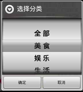 final AlertDialog dialog = new AlertDialog.Builder(this).create();		dialog.setTitle("选择分类");		final WheelView catalogWheel = new WheelView(this);		dialog.setButton("确定", new DialogInterface.OnClickListener() {			@Override			public void onClick(DialogInterface dialog, int which) {				dialog.dismiss();				// 实现下ui的刷新			}					});		dialog.setButton2("取消", new DialogInterface.OnClickListener() {						@Override			public void onClick(DialogInterface dialog, int which) {				dialog.dismiss();			}		});			catalogWheel.setVisibleItems(5);                // 设置显示的字,CATAS为种类的名字		catalogWheel.setAdapter(new ArrayWheelAdapter<String>(CATAS));		dialog.setView(catalogWheel);