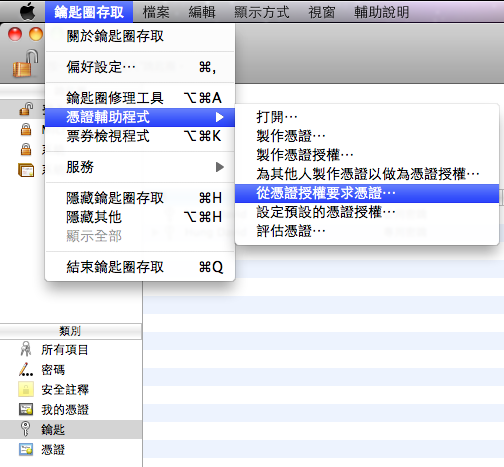 3. 開啟 keychain 程式後,由鑰匙圈存取?→?憑證輔助程式?→?從憑證授權要求憑證