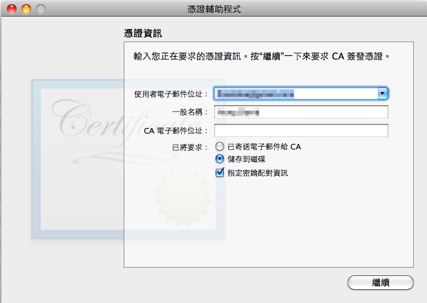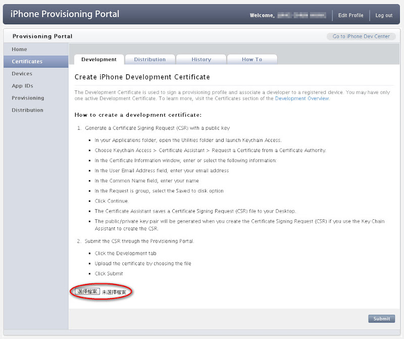 2. 點取”選擇檔案”,將剛剛在Mac上利用Keychain做出來的 CertificateSigningRequest.certSigningRequest 檔匯入