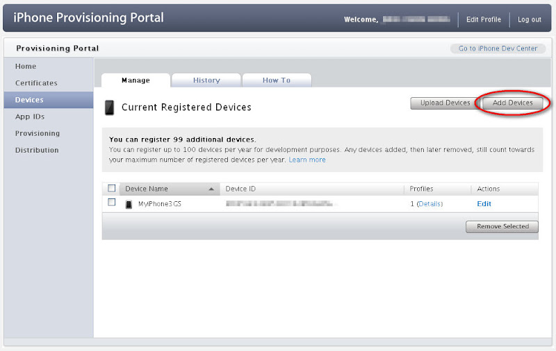 4. 建立測試Device清單。點選Devices?→?Add Devices,輸入你想取的名字及Device ID。Device ID即要靠一開始提到的Ad Hoc Helper程式得到