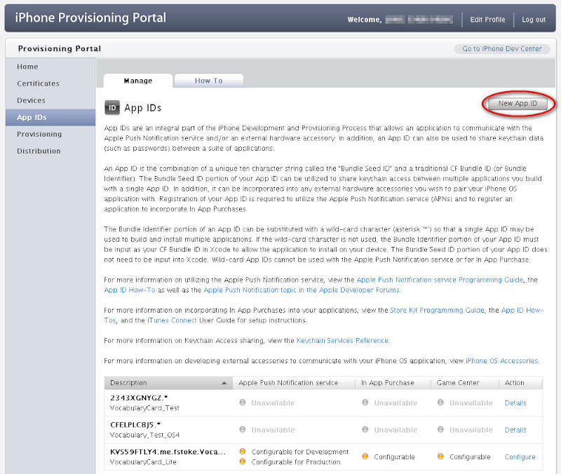 5. 建立App ID。點選App IDs?→?New App ID,照著表格填寫即可。請注意! 一旦建立一個App ID後,將永遠不能刪掉 (不知道以後會不會開放,Apple的說法是因為他們要留下來做記錄)。所以請不要建立太多App ID以免造成自己的困擾 (像我一樣… =.,=)