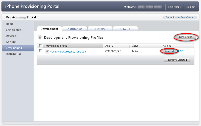6. 建立Provision Profile。點選?Provisioning?→?Development?→?New Profile。照著表格填寫即可,建好之後點選Download會下載一個名為?[Profile Name].mobileprovision?的檔案