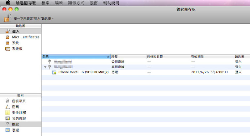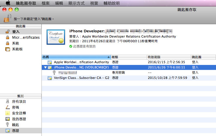7. double click developer_identity.cer 檔會開啟keychain,會看到已經多了一個iPhone Development的憑證。注意到上面有個Apple Worldxxx的憑證,即是 AppleWWDRCA.cer 憑證寫入的