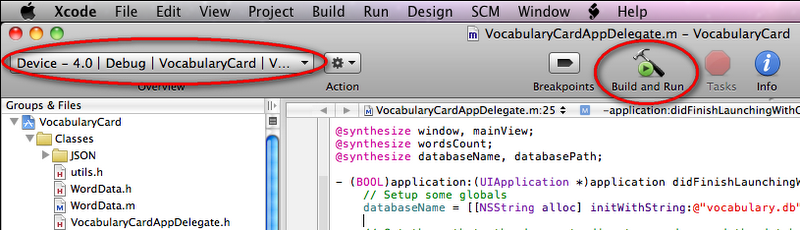 9. Okay! 一切都準備完了,接下來就是開啟XCode將App Upload到你的iPhone上去囉。執行環境選擇 Device → Run! 等它跑完… 恭喜!! 你終於可以在你的iPhone上Run你的程式囉!?