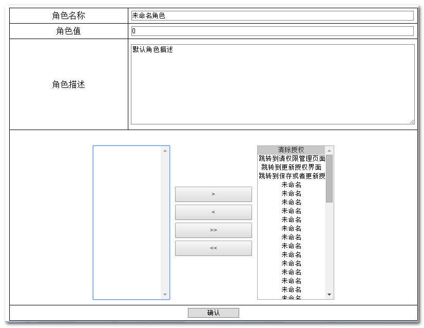 1 <script type="text/javascript"> 2 $().ready(function(){ 3 $("button[id='toRight']").unbind("click"); 4 $("button[id='toRight']").bind("click",function(){ 5 var noneOwnRights=$("select[name='noneOwnRights']"); 6 var ownRights=$("select[name='ownRights']"); 7 $("select[name='ownRights'] option:selected").each(function(){ 8 noneOwnRights.prepend($(this).clone()); 9 $(this).remove();10 });11 return false;12 });13 $("button[id='toLeft']").unbind("click");14 $("button[id='toLeft']").bind("click",function(){15 var noneOwnRights=$("select[name='noneOwnRights']");16 var ownRights=$("select[name='ownRights']");17 $("select[name='noneOwnRights'] option:selected").each(function(){18 ownRights.prepend($(this).clone());19 $(this).remove();20 });21 return false;22 });23 $("button[id='allToRight']").unbind("click");24 $("button[id='allToRight']").bind("click",function(){25 var noneOwnRights=$("select[name='noneOwnRights']");26 var ownRights=$("select[name='ownRights']");27 $("select[name='ownRights'] option").each(function(){28 noneOwnRights.append($(this).clone());29 $(this).remove();30 });31 return false;32 });33 $("button[id='allToLeft']").unbind("click");34 $("button[id='allToLeft']").bind("click",function(){35 var noneOwnRights=$("select[name='noneOwnRights']");36 var ownRights=$("select[name='ownRights']");37 $("select[name='noneOwnRights'] option").each(function(){38 ownRights.append($(this).clone());39 $(this).remove();40 });41 return false;42 });43 $("#submit").unbind("click");44 $("#submit").bind("click",function(){45 $("select[name='ownRights'] option").each(function(){46 $(this).attr("selected","selected");47 });48 return true;49 });50 });51 </script>