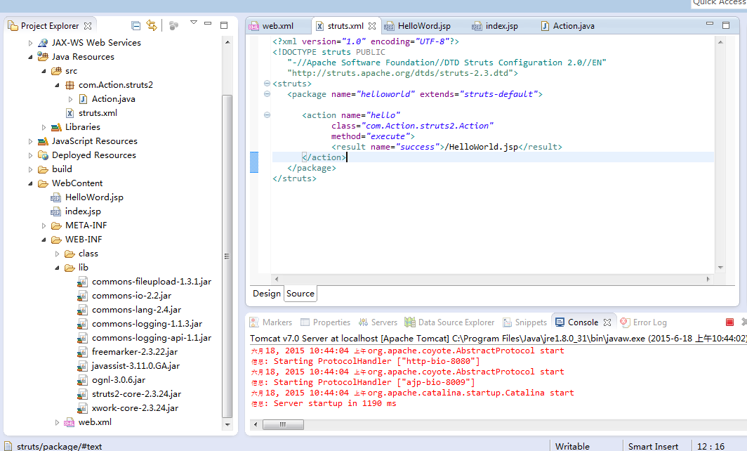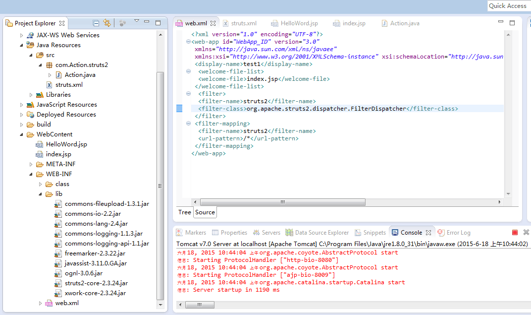 目前正在学习struts2的架构,按网上搜到的创建了个例子,但是一直运行不起来,求大神指导一下啊。。