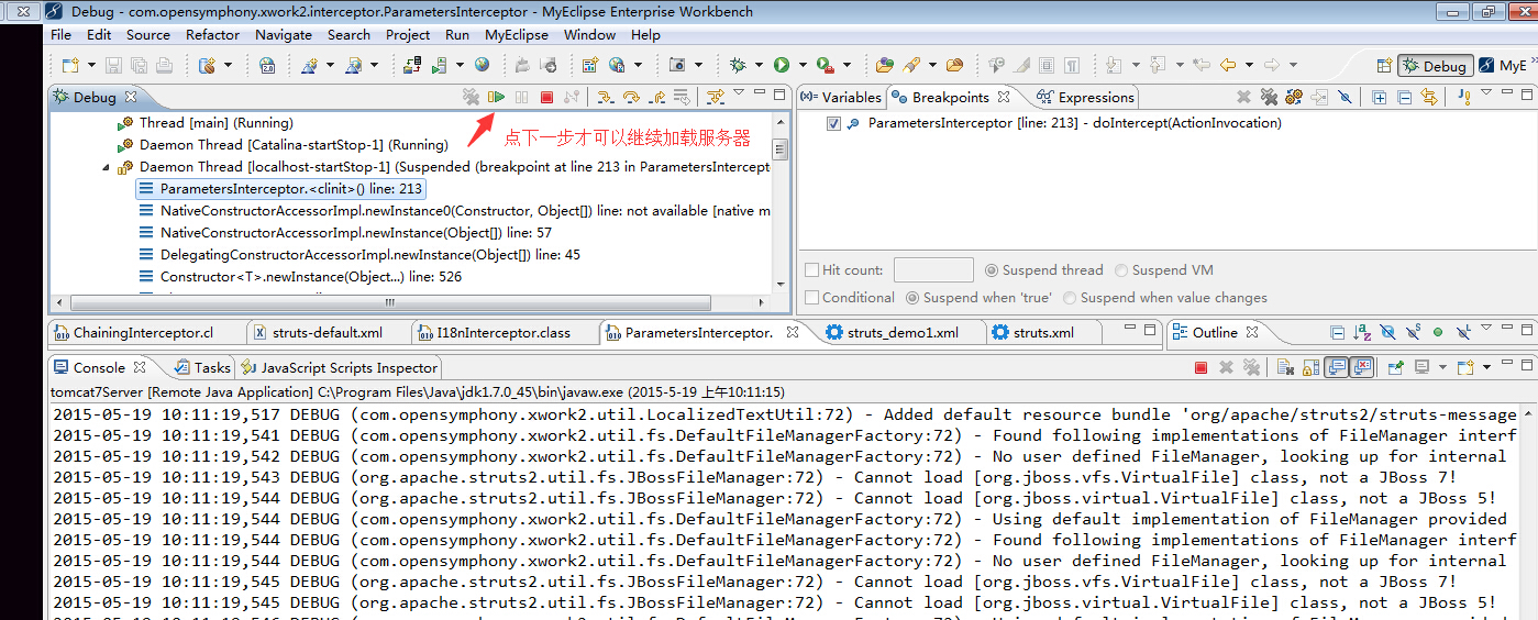 最近在学Struts2 在拦截器里设置了几个断点,想看他的走向,可是设置ParametersInterceptor的时候,打开服务器,他就跳到了DEBUG模式,必须等ParametersInterceptor走完,才能完全打开服务器,很郁闷,试了好久也没找到办法,按道理来说应该访问action的时候拦截器才会走啊。其他的断点没问题。