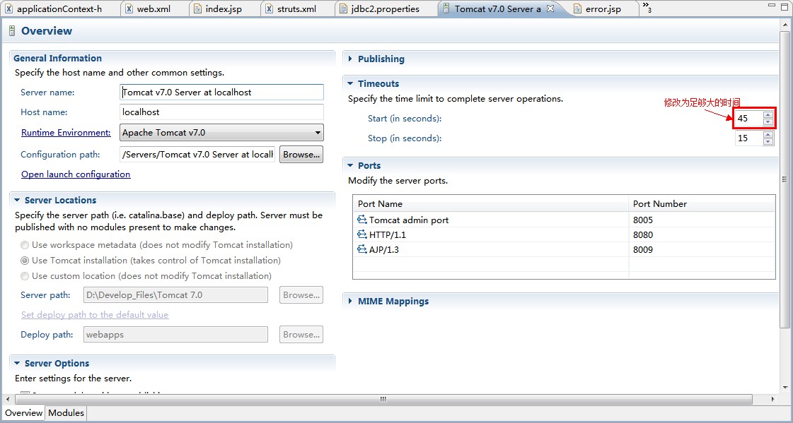把你的eclipse中的tomcat启动时间设置大点,如120秒