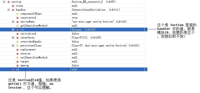 我用Debug追踪的Section这个实体,是个代理类,里面有Section的ID值,但是却是放在handler里面,我想要这个值,怎么破?