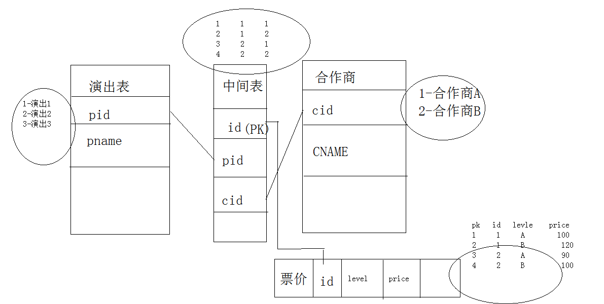 我想要的结果就是根据演出Id查询出2家合作商的各个等级的价格