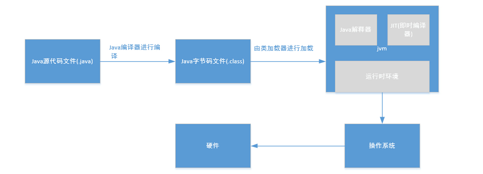 java程序源文件(.java)由java编译工具编译成.class文件,jvm中的类加载器读取.class中的字节码内容,并执行其中的字节码指令,在此期间,jvm还兼顾着管理java程序的运行内存,通过操作系统来调用相关硬件。