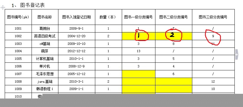 要求:根据图书分类表,更新图书登记表中黄色区域信息