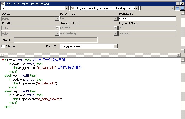 1.如果你把代码写到窗口的事件里,event_id 为 pbm_syskeydwon,是可以触发的,你的代码也可以执行,但问题是如果焦点在数据窗口上的话就不执行了,在窗口里的按钮上是可以执行的