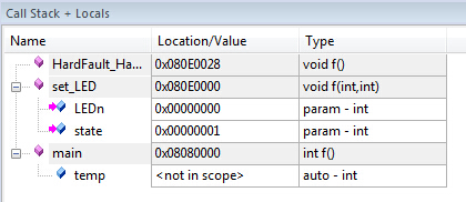 在调试状态,可以看到是进入了set_LED这个函数的,但是再进行下去就直接HardFault_Handler了。