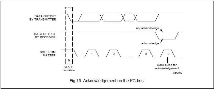 这里是主设备写一个地址加一个读/写位过去,然后从设备如果收到是自己的地址,下一个时钟就会发一个acknowledge(低电平)