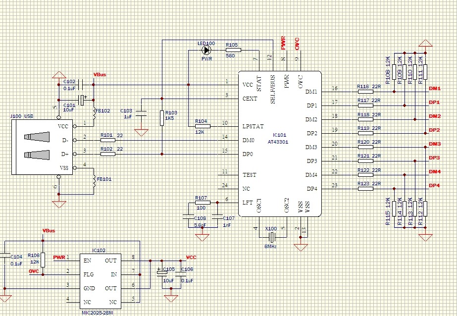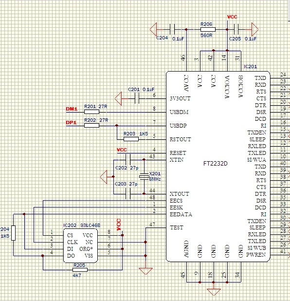 电路如图:USB芯片AT43301 USB转串口FT2232D,问题:单独将下游的FT2232芯片D+ D- 加电源,地线直接用USB线连电脑,电脑可以识别,说明FT2232电路部分OK,但是一接到上游HUB芯片的DM DP端,HUB芯片可以识别(设备管理器显示GENERIC USB HUB,是不是说明已经识别),但是没识别FT2232.连HUB后测FT2232D的晶振XTIN和XTOUT 端一端电压2.9V,一端为5V,正常应该是两个都是2.5V左右,2232芯片手册晶振电容27P,换到39P没效果,换20P也没效果,郁闷,哪位朋友有这方面经验的请教下,电路如下: