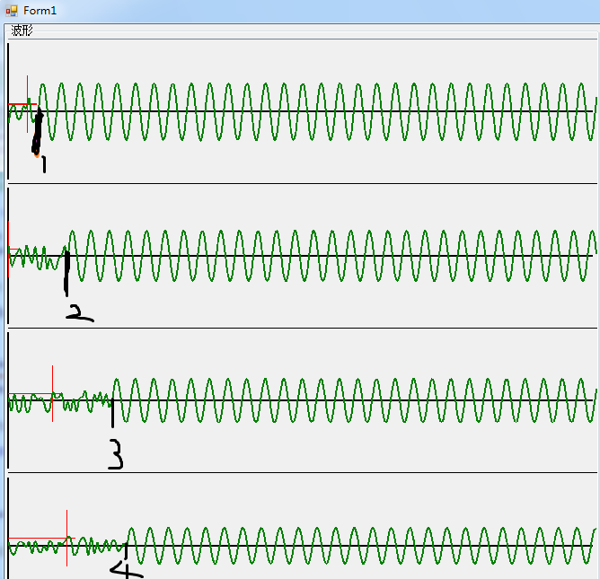 有几列波形,如下图,现要求出波形1、2、3、4的时间差,即波形2(3,4)时刻到达的时间与波形1时刻到达的时间差,没有波形时会有噪声。