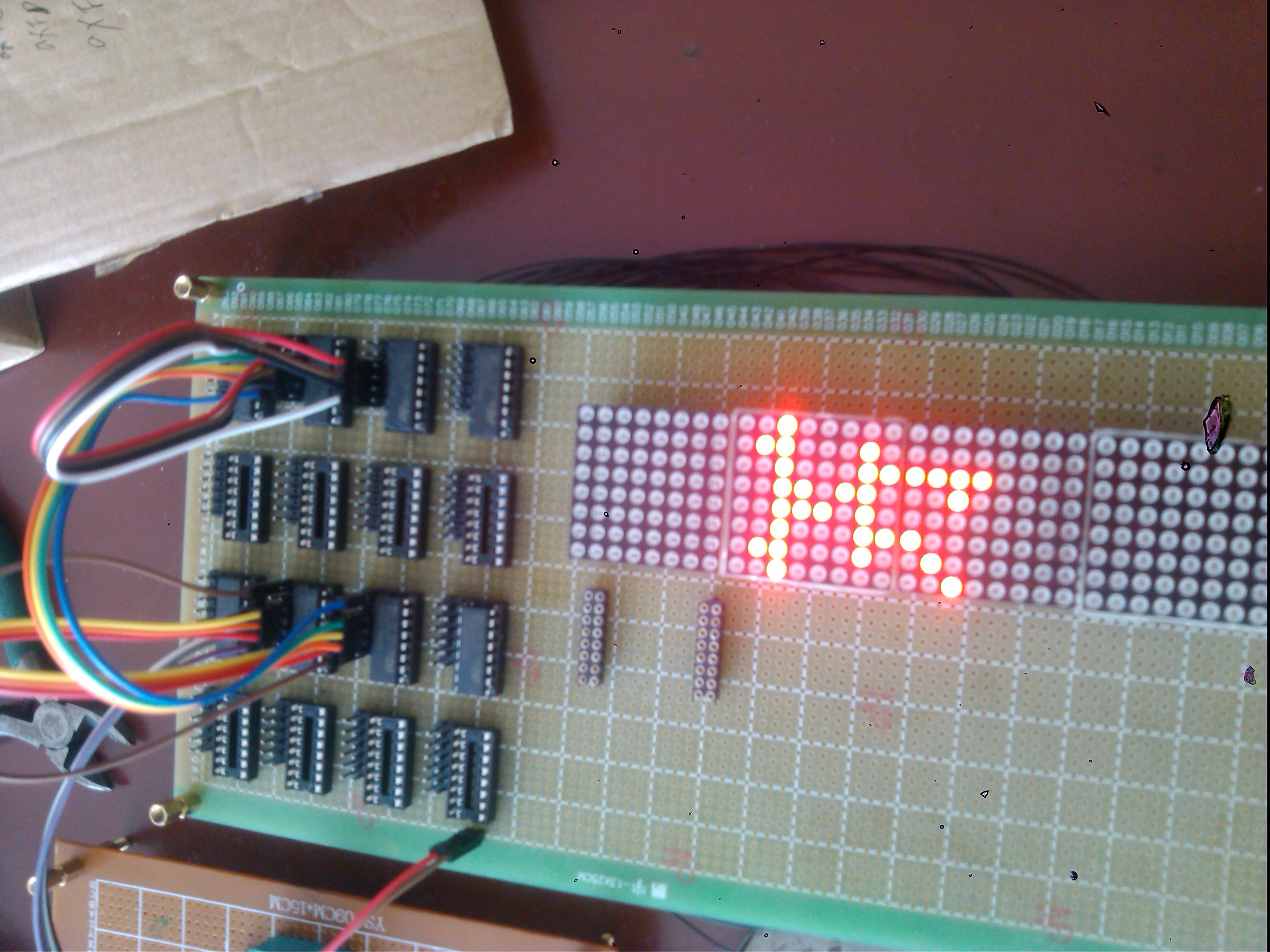 本人采用16个74hc595级联控制8快点阵显示汉字,每两块595控制一个点真的行和列,如图(1)片上一样前两排八个595是控制行的,后两排是控制列的,有两个排阵是接电源的(接红色的和褐色的那两根分别是正极和负极),给所有595 供电的,所有595的正极和负极分别两在一起接到排针上,通过单片机最小系统电源给其供电,如果只插上正极或插上负极点阵会正常显示程序,如果正负极同时插上就乱闪。图(2)是只查了电源正极或负极的情况能正常显示不过不亮。