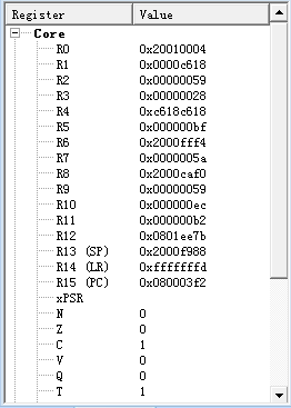 目前使用stm32f103vet6调试TFT触摸屏,用到了ucosII和ucGUI,ucosII只用了两个任务,问题是:通过调用ucGUI的创建对话框函数,使两个对话框交替重复进行创建、关闭,很有规律的重复7次左右就进入了HardFault,进入仿真调试,根据SP的内容得到LR的地址,再跳到该地址,黄色标识的那一行,这一行代表的是什么意思,怎么能看出错误是什么,为什么地址为0xc618c618,超出了RAM范围?程序没有进行优化,图片如下: