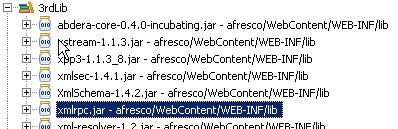 点击 New ,设置名称为 3rdLib , 然后点击 Add Jars , 把目录选择至 workspace/alfresco/WebContent/WEB-INF/lib 目录下除了含有 alfresco 字样的包统统加进 3rdLib 中.