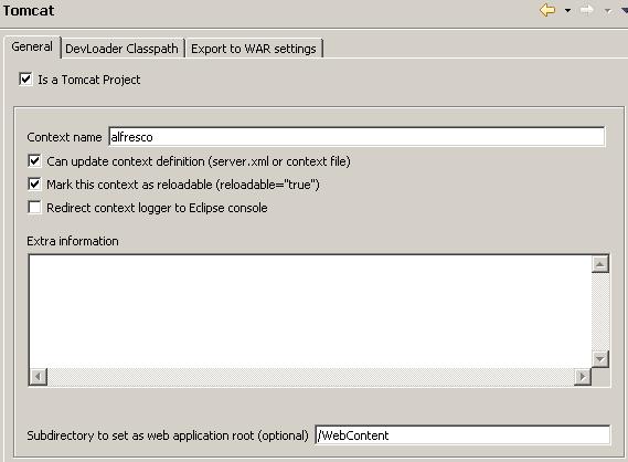 在 alfresco web 工程上点击 properties->tomcat 然后按照下图的钩选