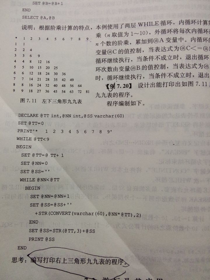 最近在学sql,遇到一个问题,就是如何用sql实现九九乘法表,我看到书上的例子实现的是正三角形的。现在思考要编写成倒三角形。希望得到各位伙伴的建议。谢谢,附图片