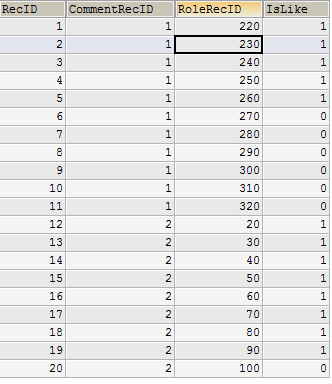 我的数据库是这样的。我有20条数据CommentRecID为规则ID,RoleRecID为用户,IsLike为用户是否喜欢,0为不喜欢,1为喜欢。