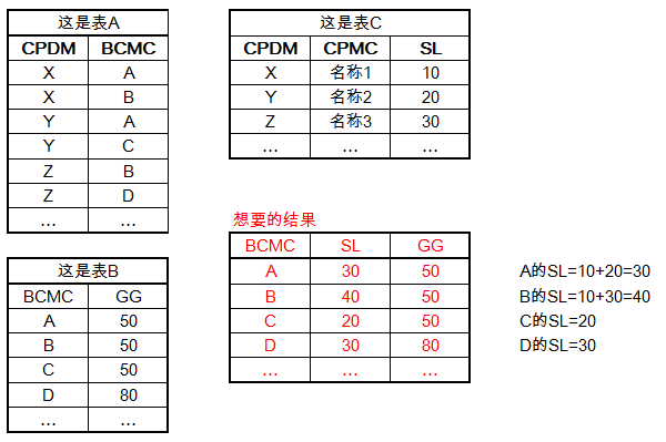 (SELECT A.BCMC,SUM(C.SL) AS SL FROM A INNER JOIN C ON A.CPDM=C.CPDM GROUP BY A.BCMC) AS A