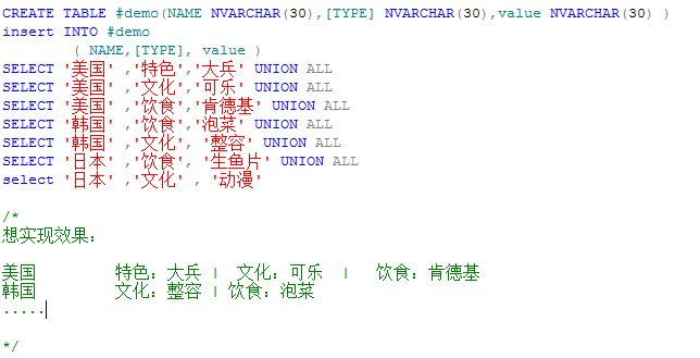 SELECT '日本','饮食','生鱼片' UNION ALL