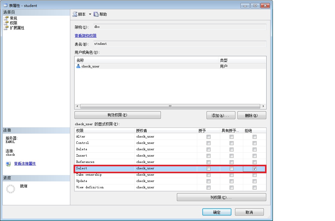 将check_db_user加入到 数据库角色db_reader,并对其中的的表d,e进行回收权限