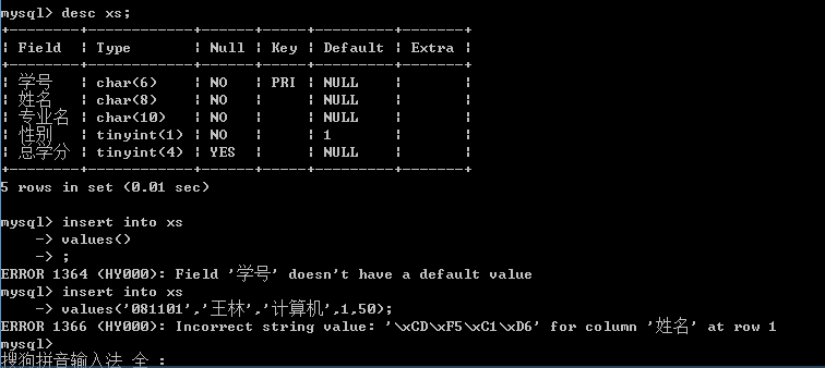 建表的时候用了中文,并且能显示出来(把my.ini中改成了gbk),但是插入数据时候不能用中文。。