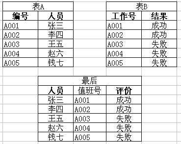 SELECT 表A.人员 AS 人员,表A.编号 AS 值班号,表B.结果 AS 评价