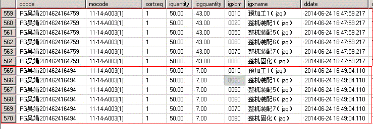 本数据是截取包工单数据的一部分,每个订单号:mocode 的每行:sortseq 会有一张或多张报工单,每个报工单子表会有多道工序,上面的表是表头表体关联查询的结果,CCODE是报工单的单据号,iquantity是订单的本行的数量,qpgquantity是本次报工的数量,希望得到的结束是,一个订单号mocode的一行sortseq,多次报工数量总和ipgquantity<=iquantity不显示任何数据,否则显示以上全部数据。本例就是43+7<=50,查选结果不显示