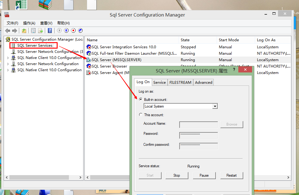 启动账号不存在SA的,你打开sqlserver配置管理器,看这里: