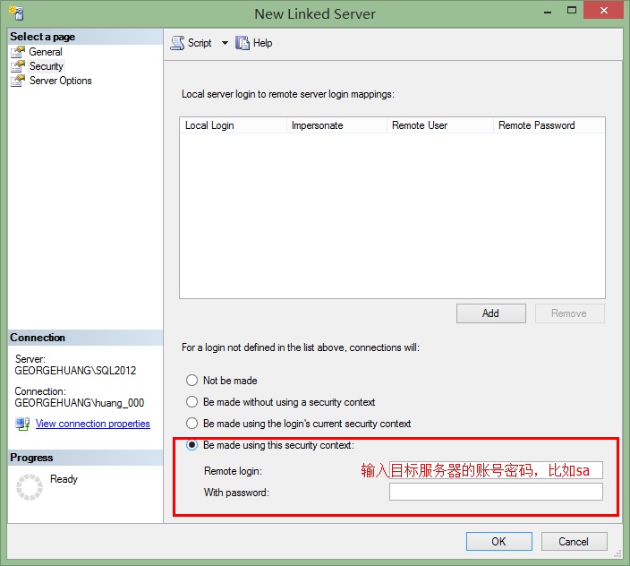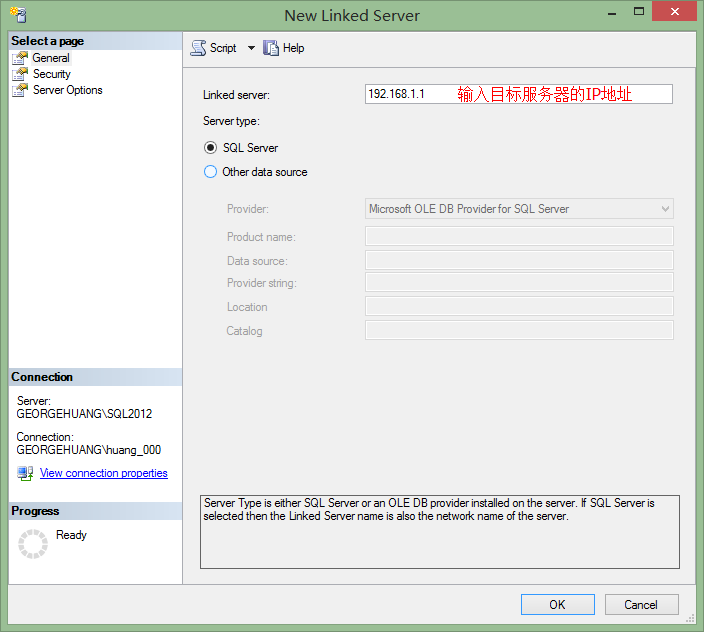 然后点ok,搭建完毕之后,可以在A中输入:select * from [b的ip地址].[库名].dbo.表名 这种方式访问b的东西,也可以向B插入数据了,前提权限要够大