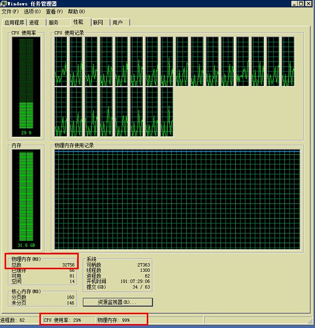 发现服务器刚启动没多久,SQL Server一个进程就占了近32G的内存,然后一直保持不变。CPU倒是在1%至30%之间波动。