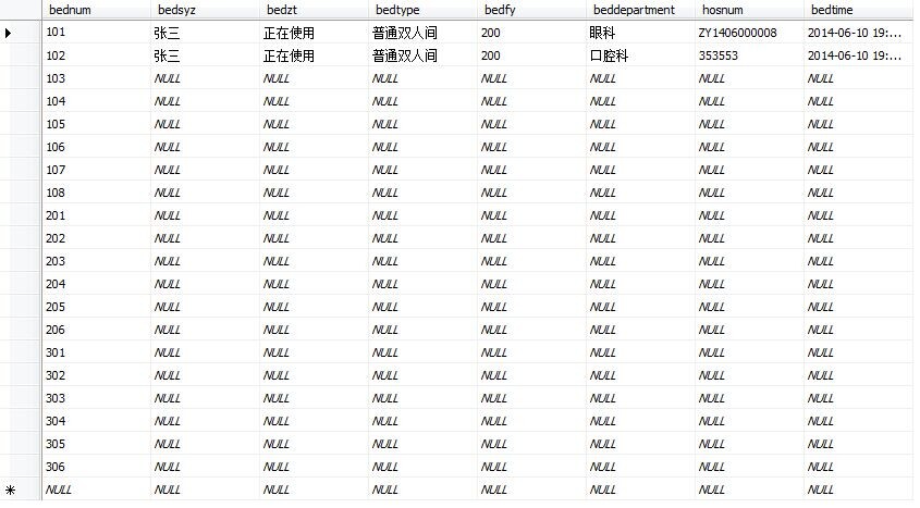 select 104,bedsyz,bedzt,bedtype,bedfy,beddepartment,hosnum,bedtime...