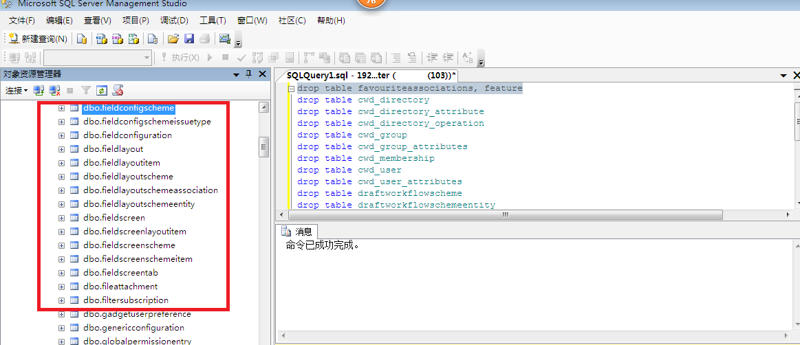 -->SSMS右边出现资源管理器-->选中表,按[Shift]建多选文件-->右键-->删除..