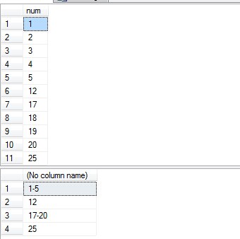 如果是连续的数据比如1,2,3,4,5 那就是1-5显示,如果不是连续的比如12,那就显示为12 ,比如17,18,19,20又是连续的,那就显示为17-20 实例: create table T(ID int) select '1' union all