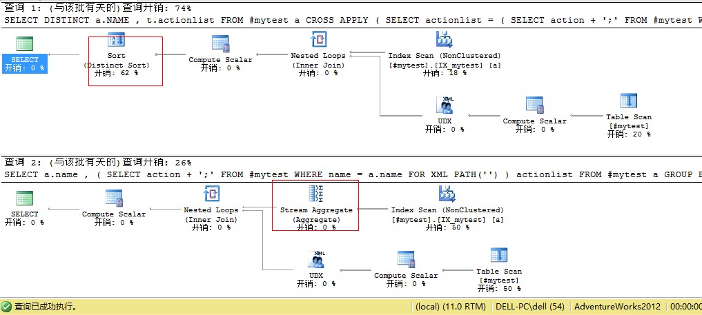 我测试了一下,上图是两个的查询计划对比,我觉得差异主要来自于查询一是对查询 cross apply后的结果进行distinct操作(name和生成的xml一起取distinct),此时distinct操作所需要的排序没办法再利用name列的索引,而查询二是对name进行group by 且name列的索引被用于group by操作而无需再进行排序的动作。