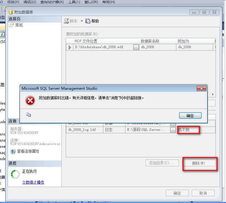 选择db_2008_log.ldf那一行删除掉,因为你只有mdf档案,没有ldf档案应该删掉这一行,让sqlserver附加的时候自动重新创建一个