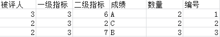 要提取出”被评人“,”一级指标“,“二级指标”,“成绩”都相同的数据,删除其中的一个字段然后计算他们的数量,然后删除多余数据只剩下一条,变成大概是这样的表: