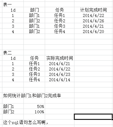 select a.部门,cast(cast(sum(case when a.计划完成时间>=a.实际完成时间 then 1 else 0 end) as float)/(count(a.部门))*100 as varchar(10))+'%' as '完成率'